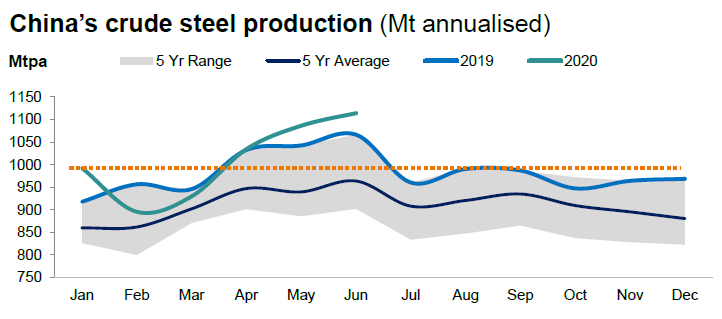 Iron ore has proven to be one of the resilient commodities in face of market volatility after Covid. This can be attributed to the V shaped economic recovery in China where the 2020 steel production was above 2019 and the prior 5 year trend.