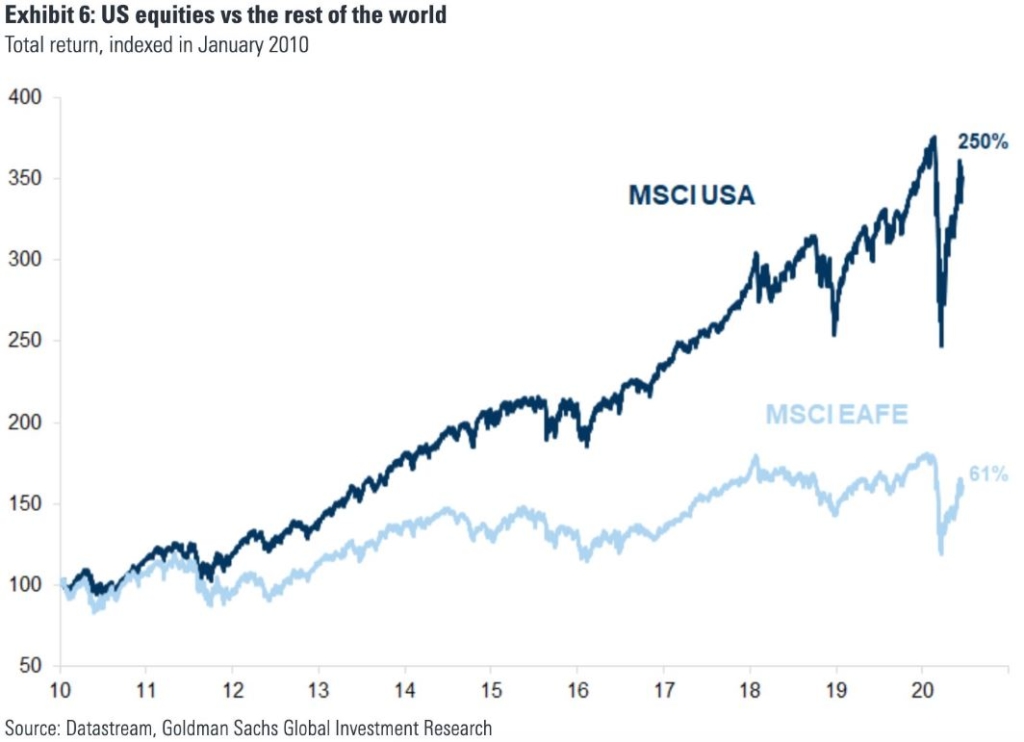 The underperformance of the European market in absolute terms vs the US can bee seen in the chart from Goldman Sachs Investment Research.