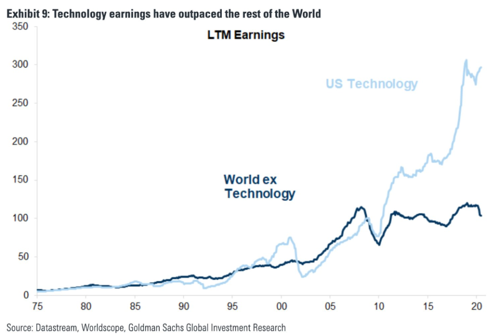 One of the major reason for this is the overwhelming outperformance of the US tech sector. As technology earnings has outpaced the rest of the world and Europe being underweight tech and over traditional sectors like autos, industrial and financials means that the overall market has lagged the US equities in the last 2 decades.